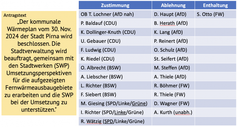 Kommentar: Wer die 102 Seiten des Abschlussberichts und unsere vorausgehenden Artikel dazu liest, weiß, dass in der Planung „zentrale und dezentrale Versorgungsgebiete“ innerhalb Pirnas benannt werden müssen. So haben die meisten Eigentümer*innen der Gebäude in Pirna (bis auf die in den Prüfgebieten) Planungssicherheit zu einem sehr frühen Zeitpunkt gewonnen. Sie können entscheiden, ob sie anstelle von Gas bzw. Öl die Wohnungen mit regenerativ erzeugter Fernwärme zentral oder mit Biogas bzw. einer Wärmepumpe dezentral beheizen wollen. Noch unverständlicher (sprachlich / inhaltlich) sind die Ausführungen von SR R. Böhmer (Fraktionsvorsitzender FW) in der parteieigenen Homepage nach der Ratssitzung. Mehr als 1 Jahr ausführliche Beratungen im eigenen SEA-Ratsausschuss und eine angebliche „ad hoc-Entscheidung“ in der abschließenden Ratssitzung sind ein Widerspruch. Von Seiten der FW gibt es keinerlei inhaltliche Auseinandersetzung mit den Ergebnissen des Abschlussberichts. Denn Behauptungen à la „Ideologie- und Schenkungs-Politik dieser Bundesregierung“ (immerhin keine Grünen) sind keine Argumente im Zusammenhang mit dem Bericht zur „kommunalen Wärmeplanung für Pirna“.