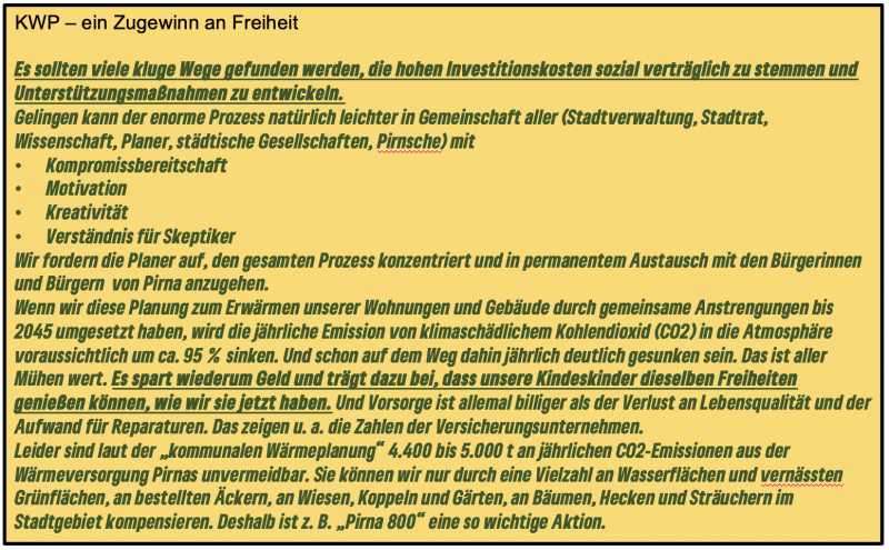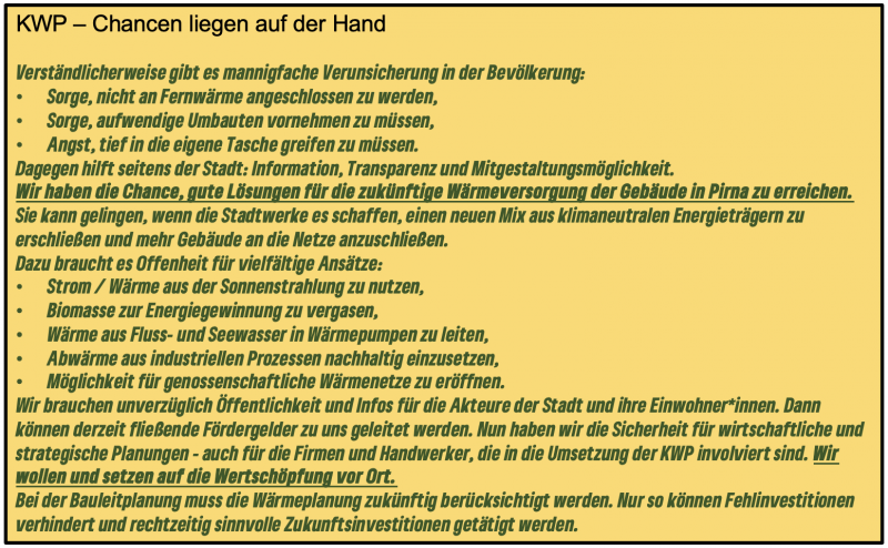 Kommentar: Wer die 102 Seiten des Abschlussberichts und unsere vorausgehenden Artikel dazu liest, weiß, dass in der Planung „zentrale und dezentrale Versorgungsgebiete“ innerhalb Pirnas benannt werden müssen. So haben die meisten Eigentümer*innen der Gebäude in Pirna (bis auf die in den Prüfgebieten) Planungssicherheit zu einem sehr frühen Zeitpunkt gewonnen. Sie können entscheiden, ob sie anstelle von Gas bzw. Öl die Wohnungen mit regenerativ erzeugter Fernwärme zentral oder mit Biogas bzw. einer Wärmepumpe dezentral beheizen wollen. Noch unverständlicher (sprachlich / inhaltlich) sind die Ausführungen von SR R. Böhmer (Fraktionsvorsitzender FW) in der parteieigenen Homepage nach der Ratssitzung. Mehr als 1 Jahr ausführliche Beratungen im eigenen SEA-Ratsausschuss und eine angebliche „ad hoc-Entscheidung“ in der abschließenden Ratssitzung sind ein Widerspruch. Von Seiten der FW gibt es keinerlei inhaltliche Auseinandersetzung mit den Ergebnissen des Abschlussberichts. Denn Behauptungen à la „Ideologie- und Schenkungs-Politik dieser Bundesregierung“ (immerhin keine Grünen) sind keine Argumente im Zusammenhang mit dem Bericht zur „kommunalen Wärmeplanung für Pirna“.