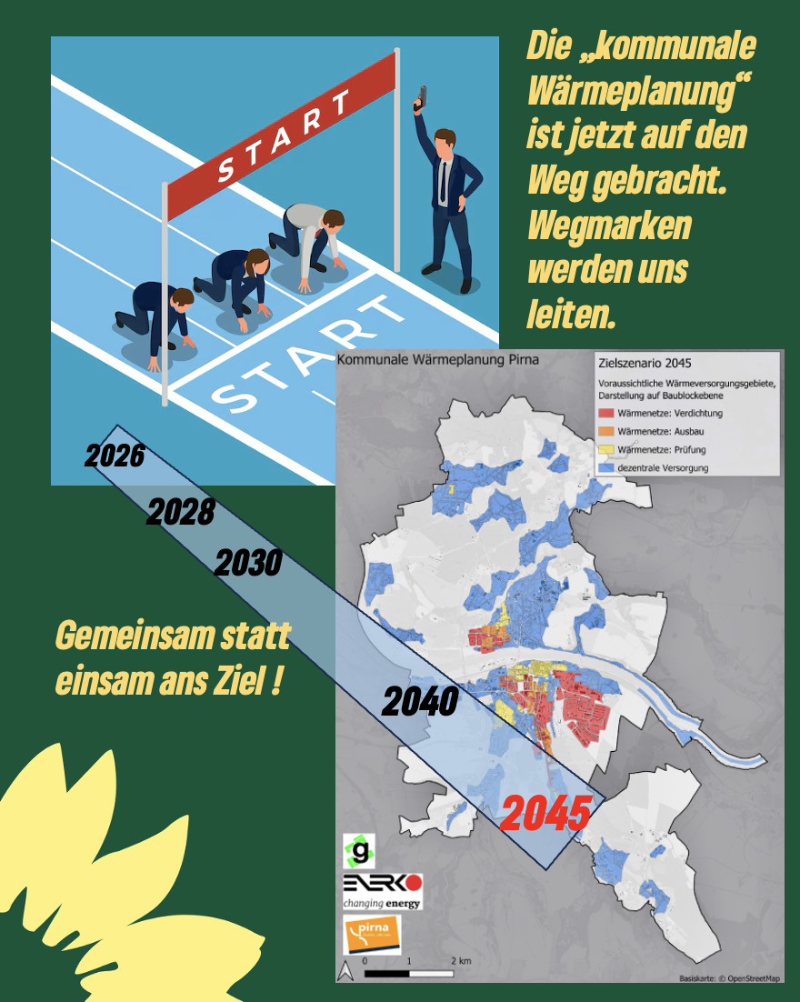 Wir haben von Beginn an auf diese Unwucht im notwendigen Engagement von Bürger*innen / Eigentümer*innen bzw. den Stadtwerken / der Stadtverwaltung hingewiesen. Als Mitglieder von Bündnis 90 / Die Grünen haben wir unsere Lektion gelernt und wollen mit aller Kraft darauf achten, dass alle Bürger*innen in Pirna bei der Wärmewende mitgenommen werden. Wir begrüßen deshalb die ersten Überlegungen zur Umsetzung der „Kommunalen Wärmeplanung“, die nach der Ratsentscheidung von Herrn Dreßler (BM Pirna) und Herrn Kochan (Stadtwerke Pirna) im „Pirnaer Anzeiger“ (Ausgabe 03/2026) veröffentlicht worden sind. Hier sind die Bürger*innen zum Glück deutlich in den Vordergrund gerückt worden.